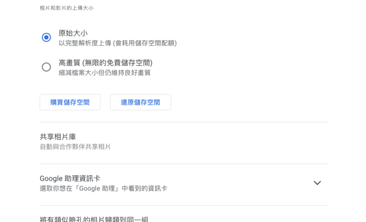 一般使用者手機中佔最多的通常是照片、影片。我覺得 Google Photo 挺方便的,跨平台支援 iOS 和 Android,操作介面也算簡單。不過容量上就有很大限制,如果上傳原始大小就會受限於其帳號在 Google Drive 有的空間,而免費帳號只有 15GB。如果上傳高畫質選項,其實就是壓縮影響畫質,雖然是無限的免費空間,但我會捨不得影響畫面品質。