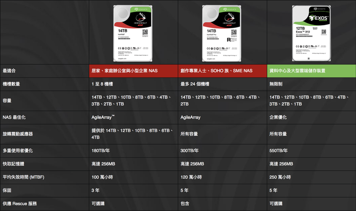 如果預算有高一點,需求更大量的讀寫可以考慮 IronWolf Pro,隨附還有兩年的資料救援計畫。當然對使用者來說,能不要用到救援是最好。