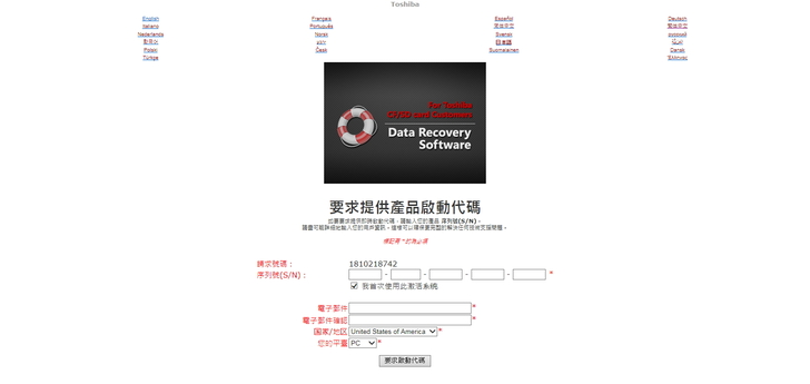 ▲軟體激活網頁,輸入內包裝背面的序號,填入 E-Mail 等相關欄位資料,按 【要求啟動代碼】