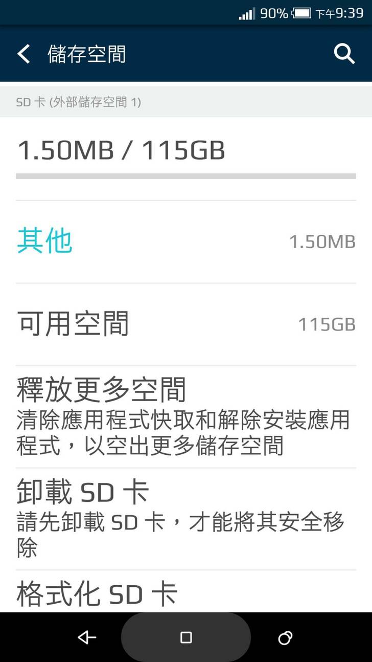 在 HTC Desire 828 上實際看 TOSHIBA EXCERIA™ M303 記憶卡 的可用空間約為 115 GB