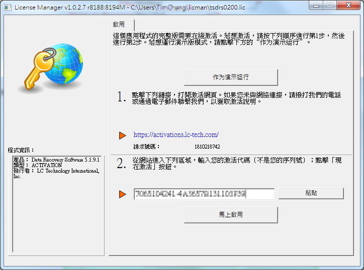 ▲輸入激活代碼(或是透過 Copy/Paste),然後按 【馬上啟用】,即可順利激活軟體