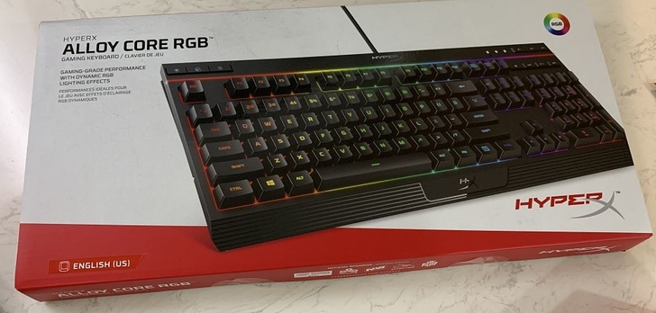 HYPERX 紅色風格邊條包裝,US英文鍵帽,旁邊是HyperX合作的戰隊LOGO