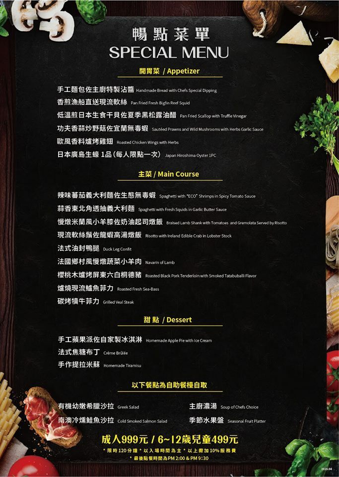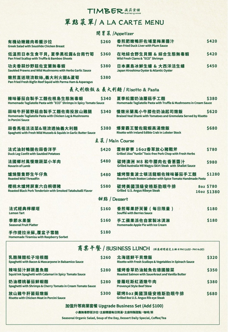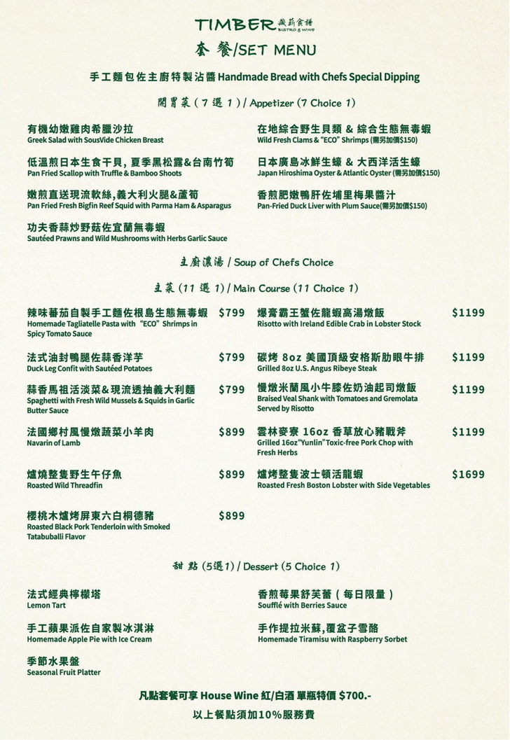 今日品嚐Timber Bistro & Wine - 藏薪法餐酒館的各項餐點都讓我很滿意,雖然比我平日用餐的預算高出一節,但在法國菜的領域來說,這價格算是很超值的,推薦大家如果有什麼重大節日要慶祝,例如家人生日,結婚紀念日之類的,可以為自己為家人留下三小時,悠閒的享受一頓法式佳餚。最近Timber Bistro & Wine - 藏薪法餐酒館聽到了大家的反應,他們在4月份的週末六日,推出了限時120分鐘吃到飽,主餐、開胃菜、主廚精選餐點通通無限暢點,只要999元+1成服務費 !!