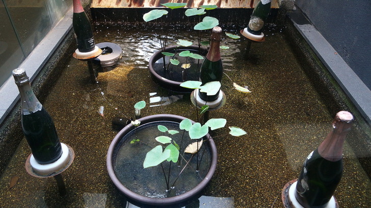 點完餐之後,我又繼續參觀店家的環境了,剛說我坐在窗邊,窗外有個小池塘。因為是餐酒館,所以池塘裡有幾個酒瓶當裝飾也是很合理的。