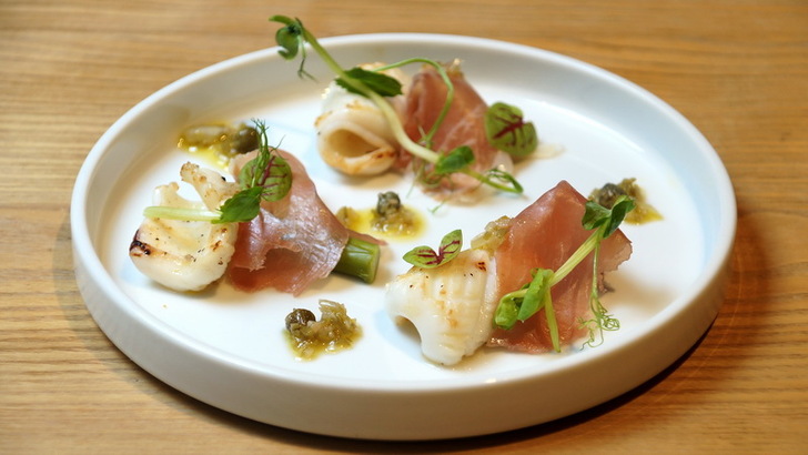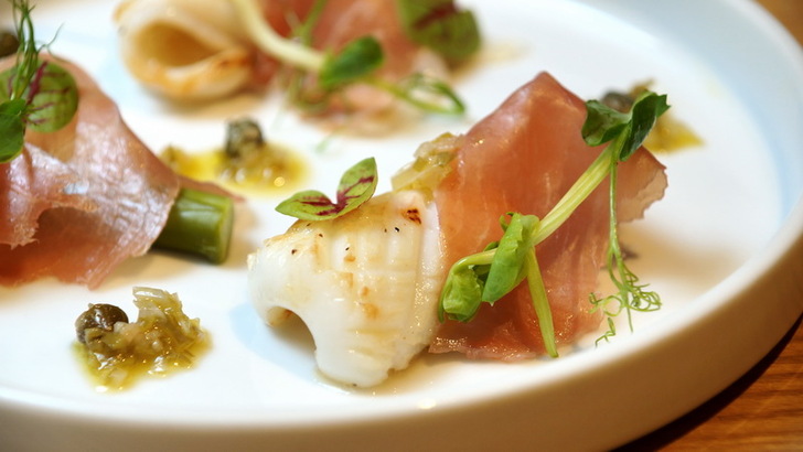 套餐第二道:嫩煎現送現流軟絲,義大利火腿&蘆筍