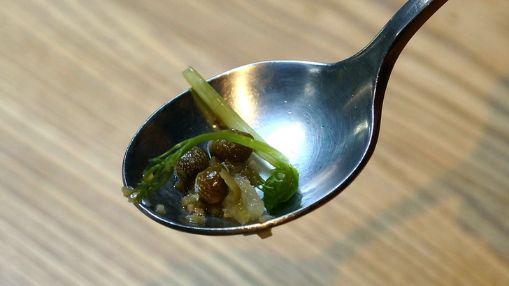 這道開胃菜對我來說實在是味覺的考驗,要小口的慢慢吃,才能品嚐到多層次的風味。