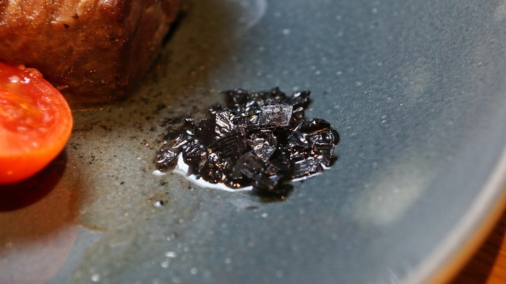 這種肉質好的豬肉,其實跟牛肉一樣,無須過度調味就有很好的風味。沾點主廚附上的黑松露鹽,就可以吃出桐德豬的甜味。令人訝異的是,桐德豬吃起來的口感非常獨特,沒有腥味之外,因為為油花分佈均勻,一口咬下豬肉不乾不澀,反而很像所謂的松阪豬肉,吃起來居然有點脆脆的,但是松阪豬肉只能切薄片,桐德豬可以大塊的呈現美味,美味與口腹滿足程度我覺得遠勝松阪豬肉啊。