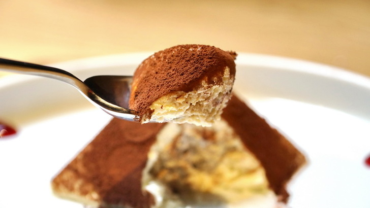 下層的提拉米蘇刻意做成金字塔模樣,裡面加了奶油乳酪(Cream Cheese),口味十分香濃,與上面的覆盆子雪酪形成強烈對比,吃一口甜在心裡。