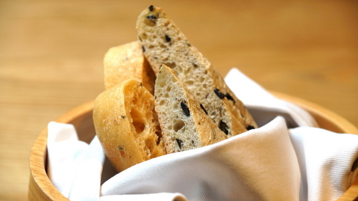隨餐附上兩種麵包,左邊的是蕃茄羅勒麵包,右邊的是橄欖麵包