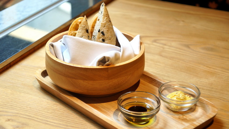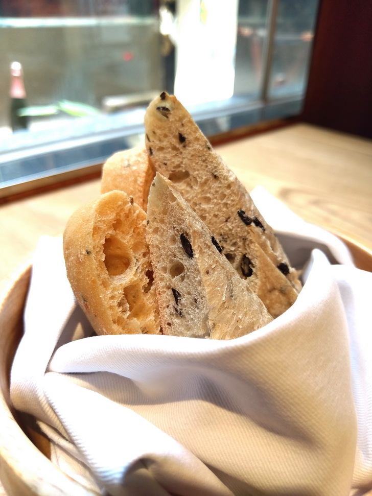 這裡的麵包口感極佳,有咬勁但不會讓你硬到咬不動,但也不像現在時下流行的軟法麵包一樣徒有歐式的外觀而已,手工麵包吃起來麥子的香氣十足,同時也吃得出蕃茄與橄欖的氣味,而且越嚼越香。所以我建議麵包上桌之後先吃一口手工麵包的原味,之後再搭配松露奶油食用。