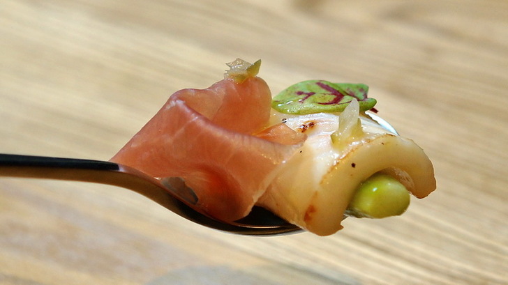 軟絲其實只有很簡單的煎一下,綠蘆筍也沒有特別調味。單獨吃一口軟絲毫無腥味,海鮮的自然甜味充滿其中,綠蘆筍的蔬菜清甜又跟海鮮的甜味完全不同。但是如果軟絲,蘆筍搭配切成薄片的義大利火腿一同食用,軟絲與蘆筍正好中和了火腿的鹹味,但增加了熟成肉類的香氣。