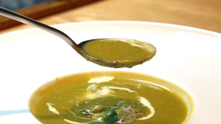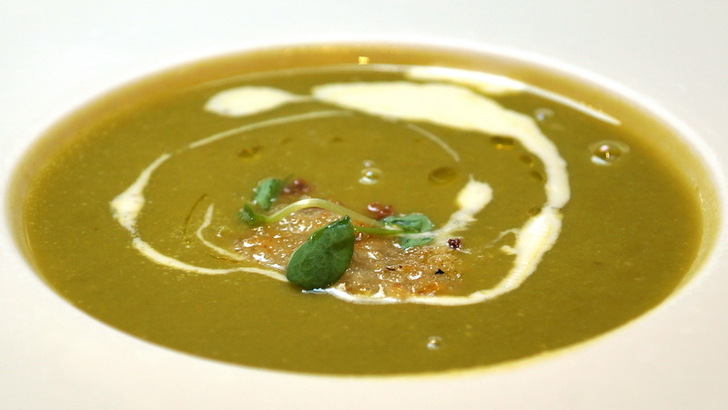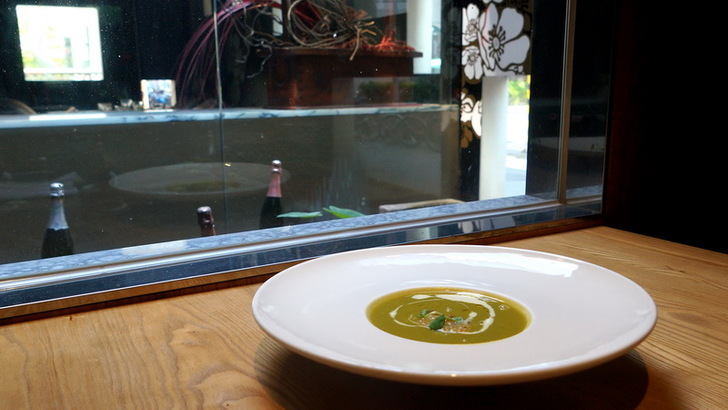 今天我喝到的主廚濃湯是甜豆仁湯,甜豆仁煮熟,加一些蒸過的馬鈴薯與其他食材後打碎過篩,加入高湯煮沸,簡單的調味後,加點鮮奶油與綠葉裝飾。