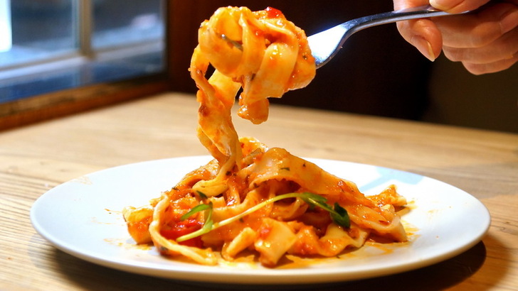 辣味蕃茄手工麵,麵條厚實口感,有嚼勁會Q彈,醬汁酸甜開胃有蒜香,好吃。