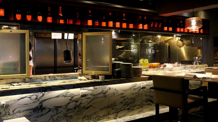 走進去一些就會看到開放式廚房,可能是怕油煙吧,用一大片玻璃隔一下,但還是可以看到主廚現場烹調料理的過程。敢採用開放式廚房,表示店家對自家的廚房衛生有信心,這樣也增添了顧客用餐的安心感。