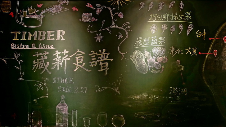 然後我還發現了一個大黑板,Timber Bistro & Wine - 藏薪法餐酒館的食材大量採用台灣在地的食材,更以無毒天然的素材為首選,選用在地食材可以大幅減少碳足跡,對地球的環保做了一點小貢獻,選用無毒天然的素材對身體好,何樂不為呢?