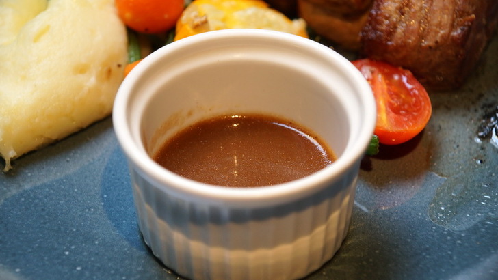 至於沾一些牛骨汁則是另一個選項,因為我沒有吃牛肉,所以請老媽代為品嚐,這裡的牛骨汁,如果沒有事先告知,老媽完全不會發現這是牛骨汁,因為一點都嚐不出牛肉的那股腥味,湯汁濃度適中但味道清爽。牛骨汁在台灣的餐飲市場算是比較冷門的醬汁,你在Google上搜尋「牛骨汁」,幾乎找不到資料,找到的都是牛骨高湯,但牛骨汁與牛骨高湯根本是兩回事。