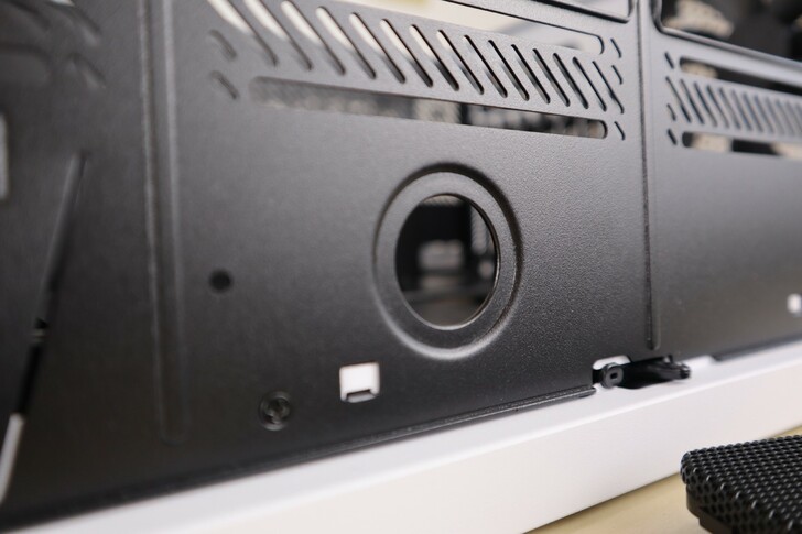 頂部可拆卸支架,將十字螺絲卸下即可取下。可以安裝三個 120mm 或 140mm 規格的風扇。中間圓型簍空是預留的水冷注水口。