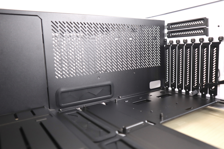 相當寬敞的空間,支援將獨立顯示卡擺放成直立。可擺放 440mm 的顯卡,若將前擋板的風扇移到其他地方,最長可支援 465mm 的顯卡。