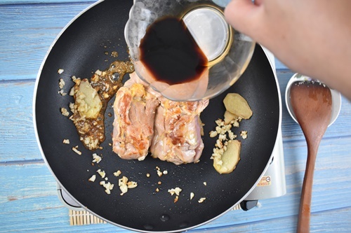 2.再加入適量的薑片-蒜末-糖-醬油-米酒,煎至雞腿皮成焦黃色