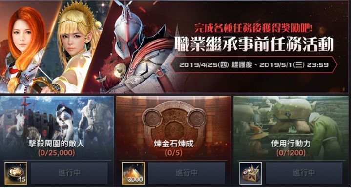 這次改版雖然還沒開放新職業繼承,不過先釋出了事前,活動時間是4/25-5/1七天,共有三個活動,整理如下: