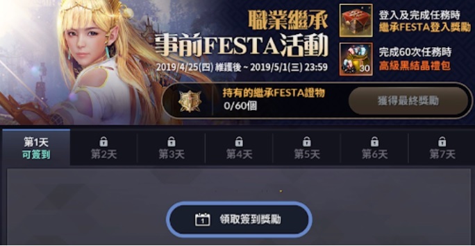點擊左上角小地圖右邊的禮物箱子圖標,畫面上的「領取簽到獎勵」每天可進行不同的任務,每次簽到和完成覺醒FESTA任務時,可獲得「繼承Festa登入獎勵」,簽到第7天並完成60個任務時,可獲得「高級黑結晶禮包30個」,若當天沒有完成任務,只要在這週活動期間完成同樣OK