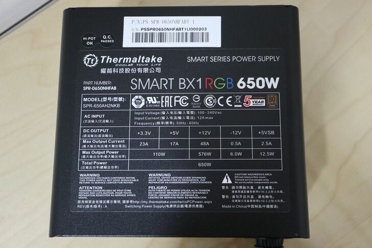 電源供應器正面則是規格規範以及各種安規標示,並說明五年保固
