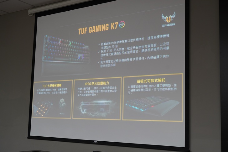 ▲TUF Gaming K7 光學機械軸電競鍵盤,採用 IP56 防水防塵標準、航空級鋁合金材質、光學機械軸以提供精準性、磁吸式腕托等設計。