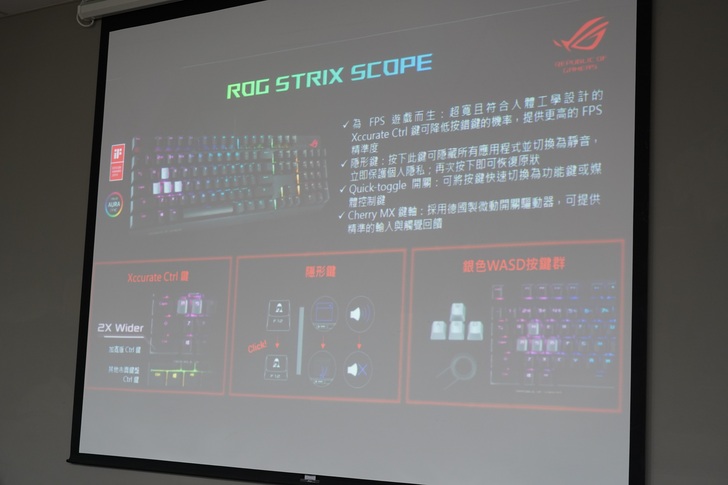 ▲ROG Strix Scope RGB 機械式電競鍵盤擁有隱形鍵:按下此鍵可隱藏所有應用程式並切換為靜音,再次按下即可恢復原狀。(業務經理說就算CPU使用率100%也能使用超厲害的)。