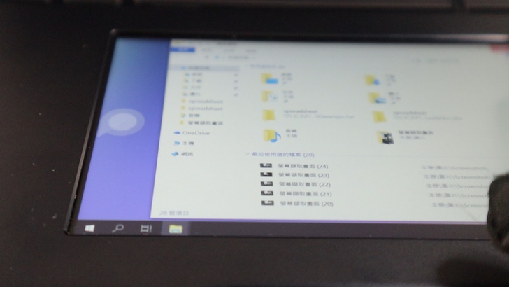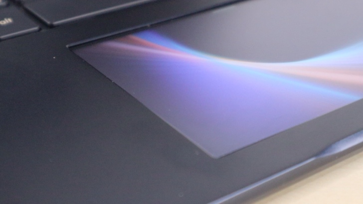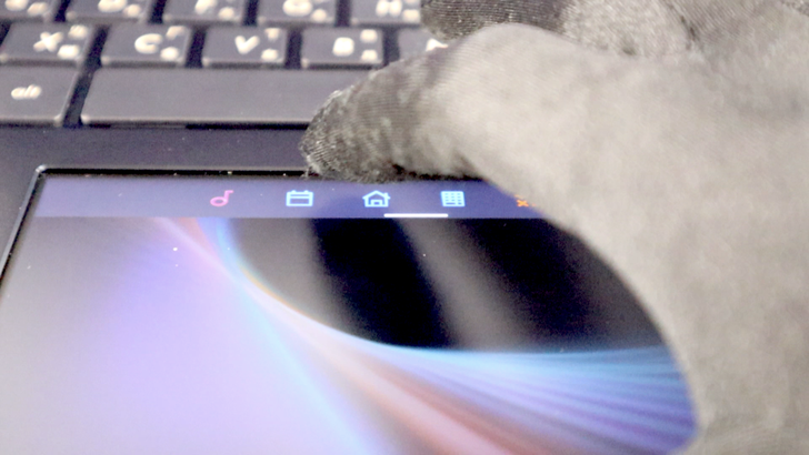 這是一片 5.5 吋的螢幕,解析度是 1920 x 1080 的 IPS 面板。UX480FD 的 C 面是金屬材質,在靠近觸控板邊緣,有鑽石倒角。觸控板本身有明顯的與由上往下滑出快速選單的操作邏輯,與手機非常類似,感覺很熟悉。