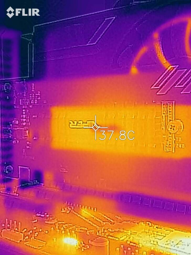 使用熱顯儀實際量測可觀察出鋁擠是有發揮出它的功用在,不論是主控、快取、記憶體模組都確實的將熱導到鋁擠散熱片上。