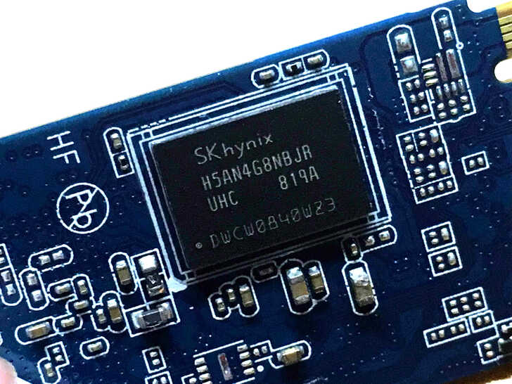 快取是由 2 個 DDR4-2400 的 Skhynix H5AN4G8NBJR 所組成,位於PCB板上前後各一 。