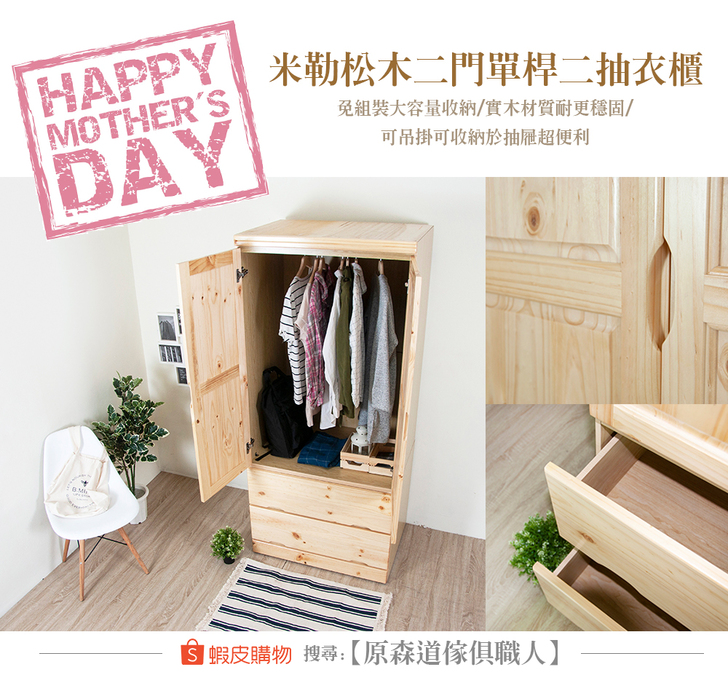✨【原森道傢俱職人】✨ 蝦皮購物~母親節優惠77折倒數中喔🎉 【米勒松木二門單桿二抽衣櫃】 ◆實木材質耐重穩固😃 ◆可吊掛可收納與抽屜超便利😎 ◆台灣製造,安心😘 ◆免組裝,省時省力好輕鬆😉 ◆大容量雙抽抽屜,收納不沾塵又美觀 🤓全館77折,趕快GOGOGO🛍 https://is.gd/bprpZO 讚 收藏 快速回應 引言回應
