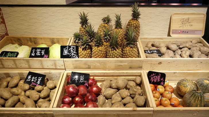 進門的旁邊,放了一堆新鮮蔬果,一格一格好像蔬果店,我問過店長,如果你要買也是可以的喔。