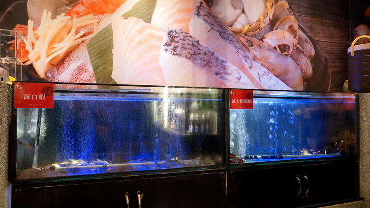櫃台的旁邊有兩個大水箱,一個有海白蝦,一個是剛剛看板廣告的活波士頓龍蝦。