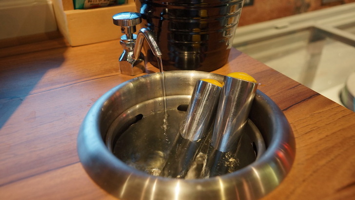 冰淇淋勺要水洗,我們的手同樣也要水洗,這家千荷田位在ATT 4 FUN裡,沒有獨立的洗手間,要上廁所要走到餐廳外面使用公用的洗手間,如果只是飯前洗手的話,千荷田裡有個很漂亮的洗手台,記得先洗手再用餐喔。