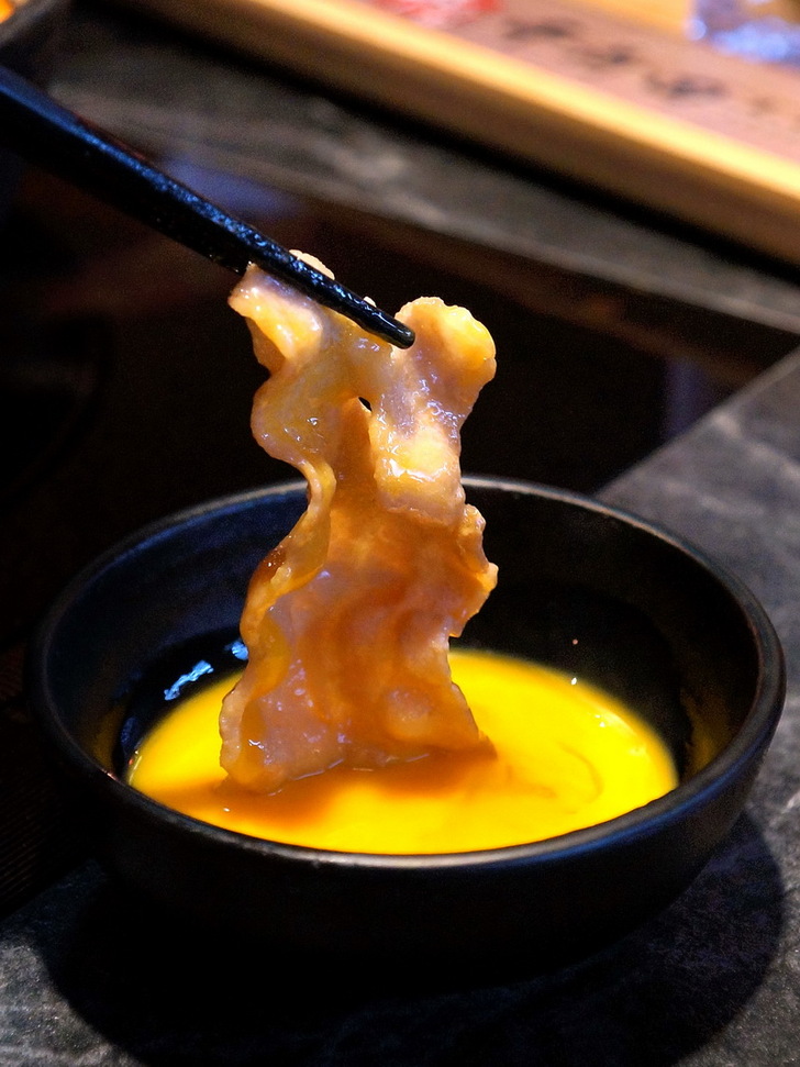 煮過的松阪肉沾上蛋汁,一吃驚為天人,肉質滑嫩,加上吸收壽喜燒湯汁的鹹甜味,美味極了。