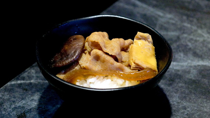 吸飽湯汁的香菇,豆腐皮與松阪豬肉放在飯上,淋上些許湯汁。一碗好吃的丼飯就完成啦。