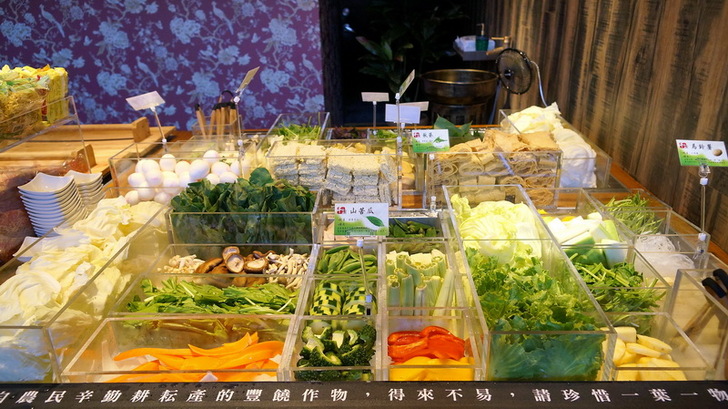 你以為千荷田的「野菜自助放題」的饗樂野菜自助吧就像傳統吃到飽火鍋店一樣,蔬菜擺在冷藏櫃裡,雖然很實用但一點也不美觀吧。如果你這麼想,其實無可厚非,因為老媽本來也是這麼想,但是到了現場一看,才驚呼原來比他想像的高級多了。