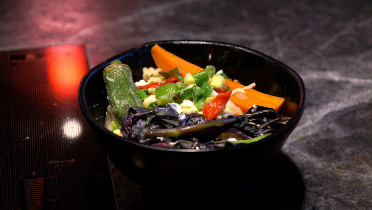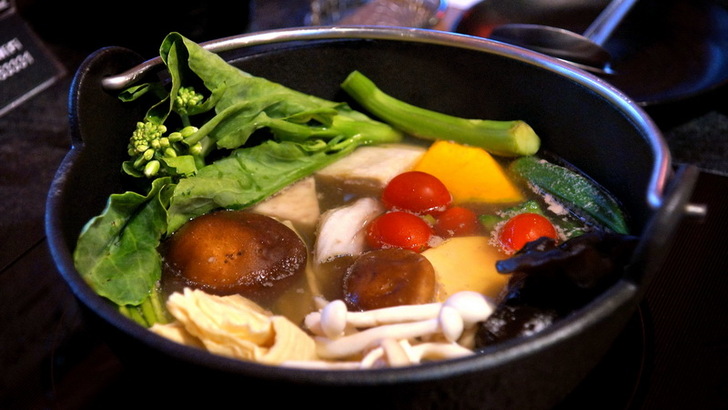 我把一堆野菜自助吧的食材丟進壽喜燒鍋一起煮,讓食材都能吸收湯汁的鹹甜味。