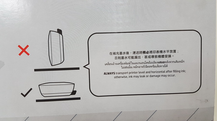 ▼ 貼心提醒印表機填充墨水後,運送需水平放置,不然可能會導致受損。