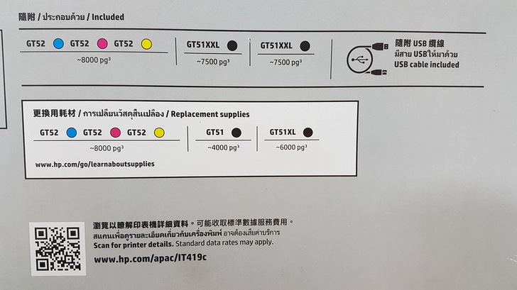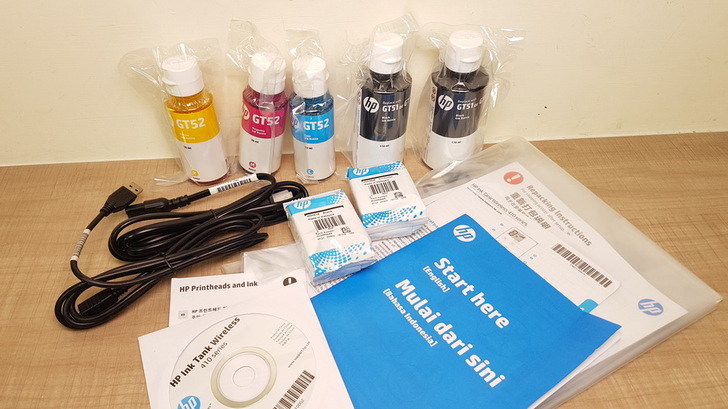 ▼ 耗材及附件:HP GT51黑色墨水瓶*2、HP GT52 青色墨水瓶、HP GT52 洋紅色墨水瓶、HPGT52 黃色墨水瓶、列印頭、軟體光碟、說明書、電源線、USB連接線。