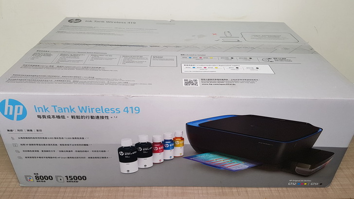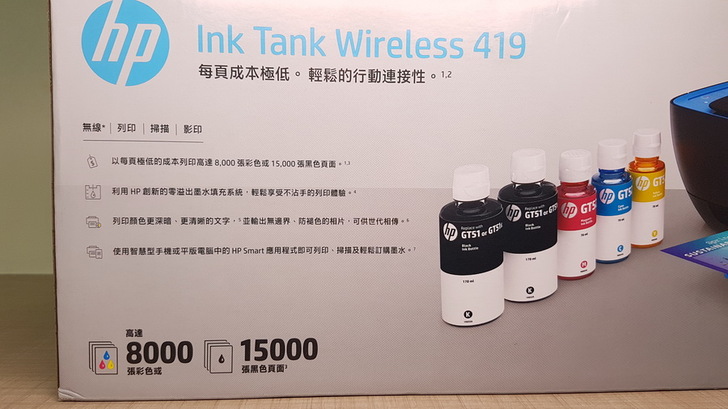 ▼ 外箱也列出 Ink Tank Wireless 419的功能及特色,高達8000張彩色或15000張黑色頁面,真的是非常狂的印量。