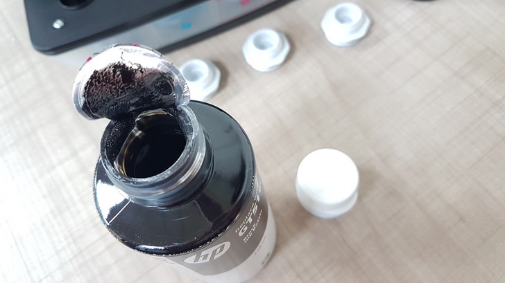 ▼ 每罐墨水都要先 拿掉瓶蓋、撕掉封口,然後對準噴嘴直接插下去,墨水就會自動填充。