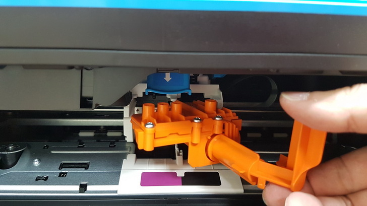 ▼ 依照說明移除 橙色的塑膠物,然後就可以裝上 列印頭。(依照圖示顏色裝就對了)