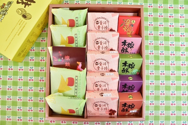 一盒裡面有旗鼓餅、愛河栗子燒、木棉酥