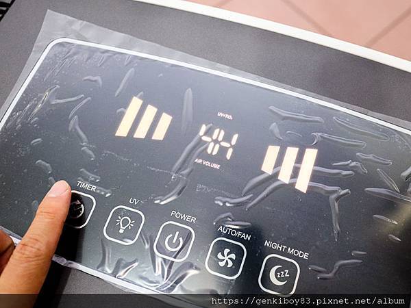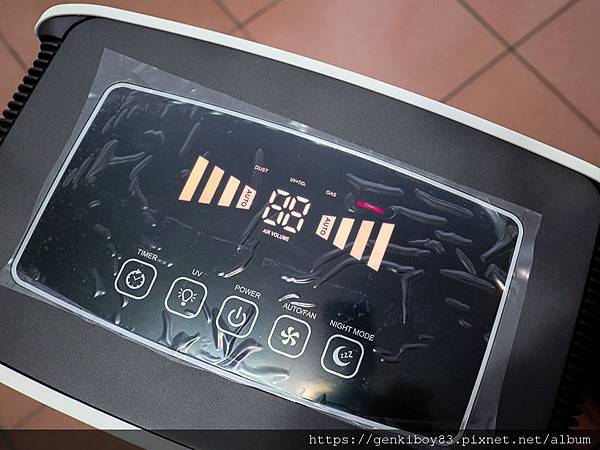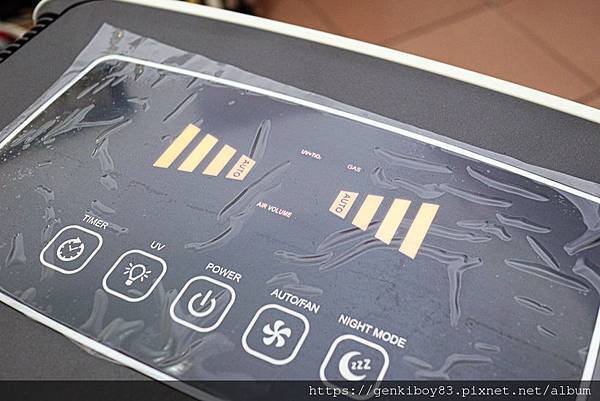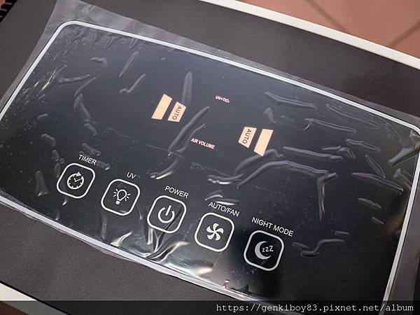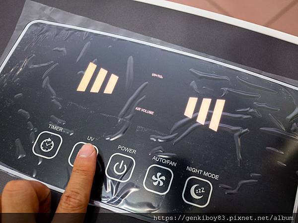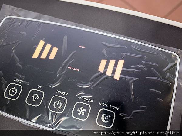機器上方的面板是以燈號方式顯示,開機時燈號會全亮進行自我檢測,最上面一排的燈號則是代表了汙染源與 UV 殺菌效果。