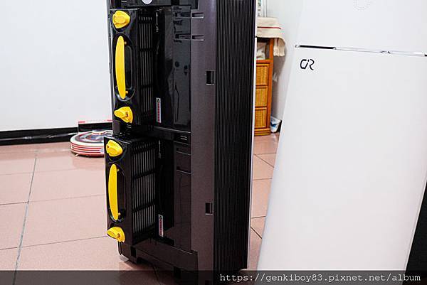 CR 空氣清淨機的高度大概 84 公分左右,比一般的立扇矮一些,看起來相當大台,但因為採用的是側進側出的方式,所以可以將機器靠在牆邊或是櫃子邊緣不影響進出風口,也不會太佔空間。機器雖然也重達 14 公斤,但下方藏有滾輪設計,可以用側推的方式移動機器。