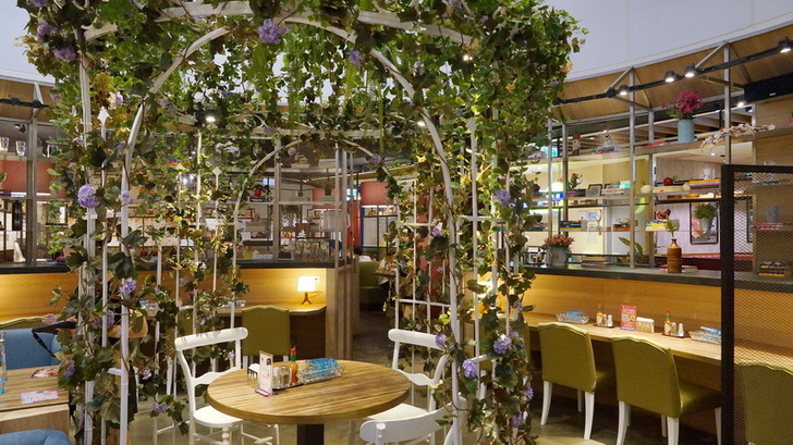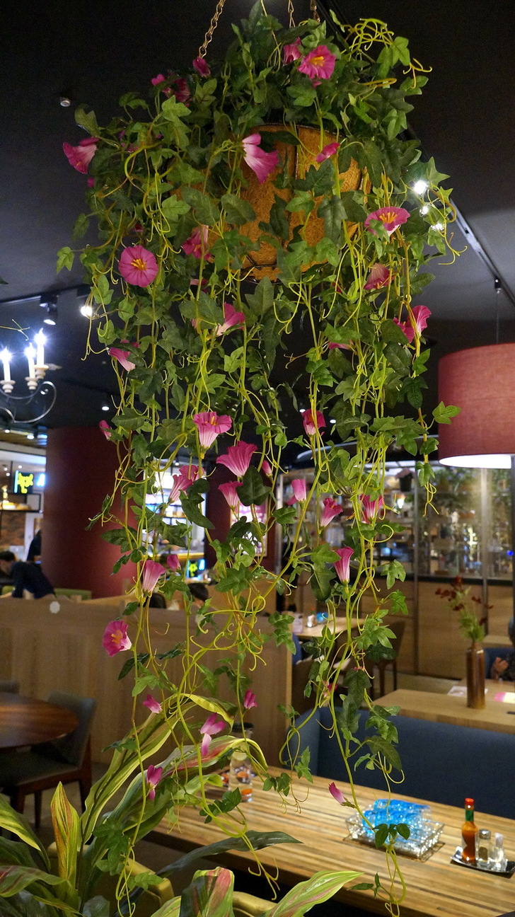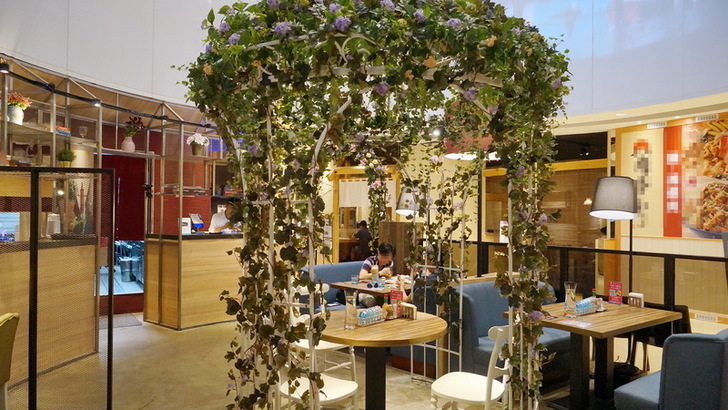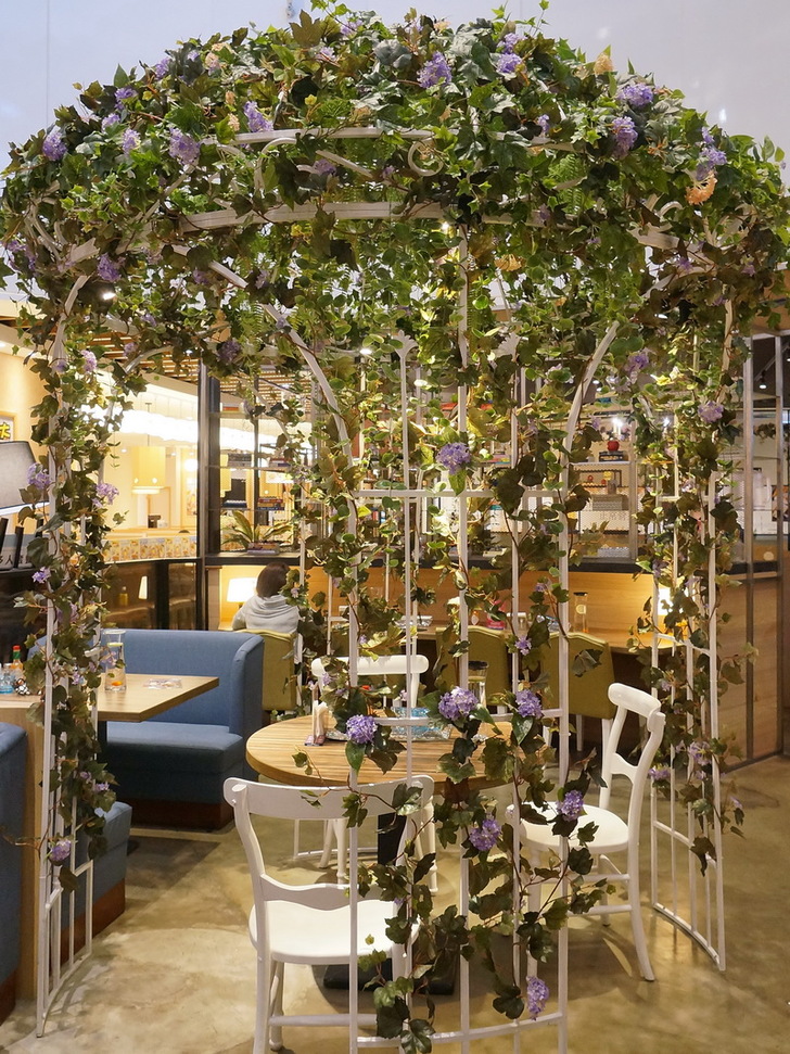 一走進餐廳裡,哇….這是隱身在百貨公司裡的城市花園啊,這個棚架上的花草雖然是人造花但是看起來有模有樣,不走近摸一下葉子仔細看一下,還以為是真的花草呢。