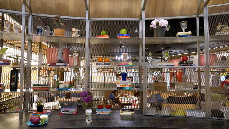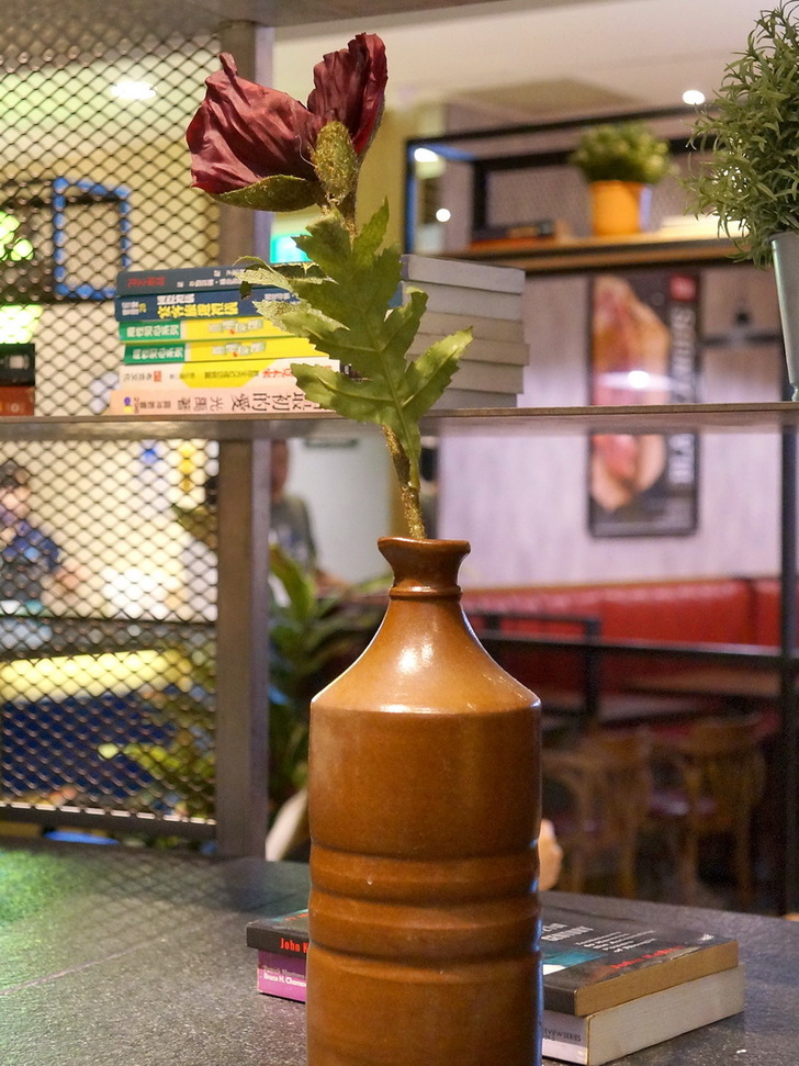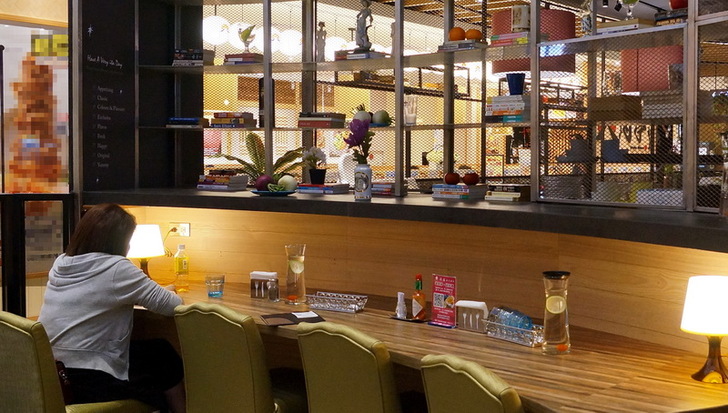 圍繞著棚架的的四周有一格一格的架子,上面擺了一些書與裝飾品,藉以區隔另外一區,這裡除了四人座的座位,也有類似圖書館的單人座,如果我一個人來的話,坐在這裡喝杯飲料,吹吹冷氣,看本書或者滑個手機,似乎也是不錯的選擇。