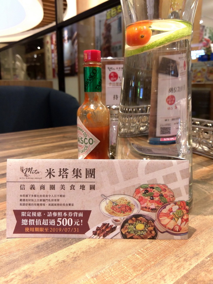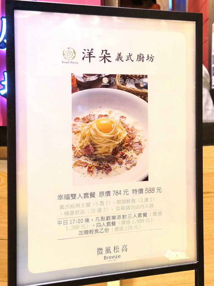 據說信義百貨商圈是全球百貨密度最高的地方,台北人如果要逛街,吹免錢的冷氣(笑),這一帶是最好不過的啦。端午節的中午,有的人正在划龍舟,有的人正在吃粽子,我們家選擇到微風松高百貨 B2的洋朵義式廚坊微風松高店吃早午餐。「洋朵義式廚坊」跟我之前用餐過的「千荷田蔬食百匯涮涮鍋」都是系出米塔集團,我認識的米塔應該是從米塔麵包店開始的,我們家一直是米塔麵包店的鐵粉,沒想到這幾年事業越做越大,創造出更多元且豐富的餐飲事業。